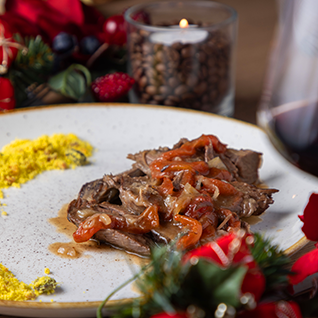 Tenro pernil de cordeiro preparado em fogo brando com cebolas e tomates.