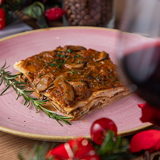 Lâminas de massa fresca artesanal, entremeadas com bechamel, mix com cogumelos ‘porcini’ e molho de tomates.