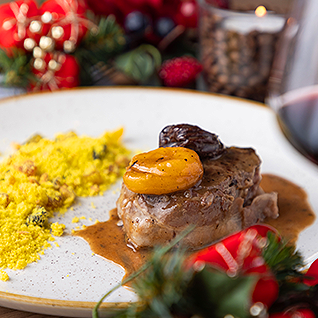 Medalhões de filet-mignon envoltos em ‘pancetta’, servidos com molho de frutas secas.