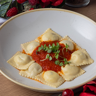 Massa fresca exclusiva, recheada com ricota e ‘mozzarella di bufala’, servida com molho de tomates.