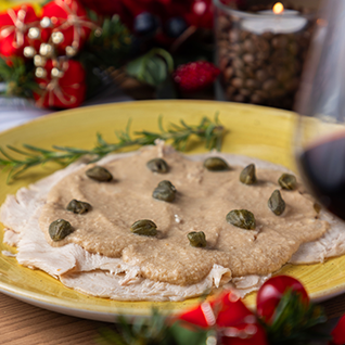 Fatias finas de peito de peru, guarnecidas com molho cremoso de atum e alcaparras.