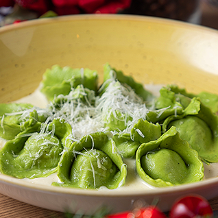 Massa fresca artesanal recheada de ricota e presunto Parma, servida com creme de parmesão.